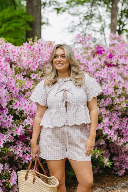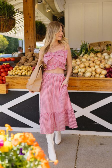 $198.00Details Red and white gingham topOversized bow frontAdjustable thin spaghetti strapsCropped lengthRuffled hemSmocked backElastic peplum waistMatching skirt sold separately Materials and Care Self: 50% Polyester, 50% CottonLining: 97% Polyester, 3% SpandexHand wash coldHang to dry All sale items considered final sale.